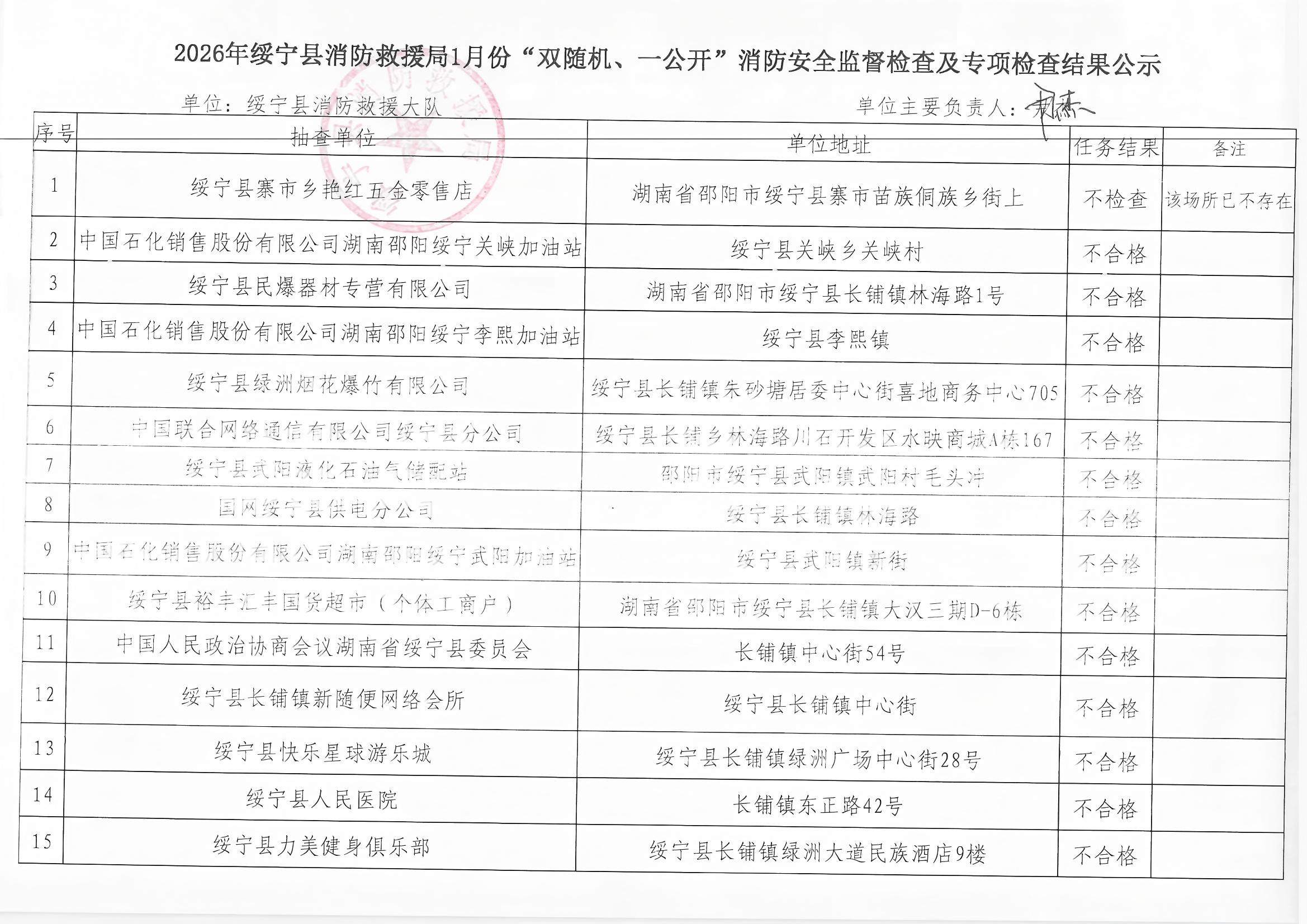 2026年绥宁县消防救援局1月份“双随机、一公开”消防安全监督检查及专项检查结果公示