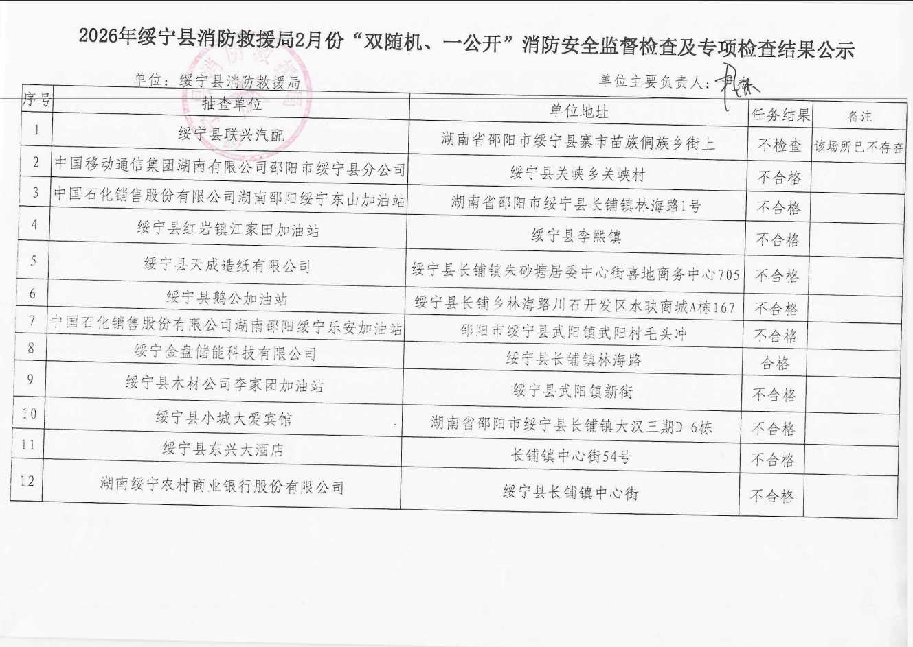 2026年绥宁县消防救援局2月份“双随机、一公开”消防安全监督检查及专项检查结果公示