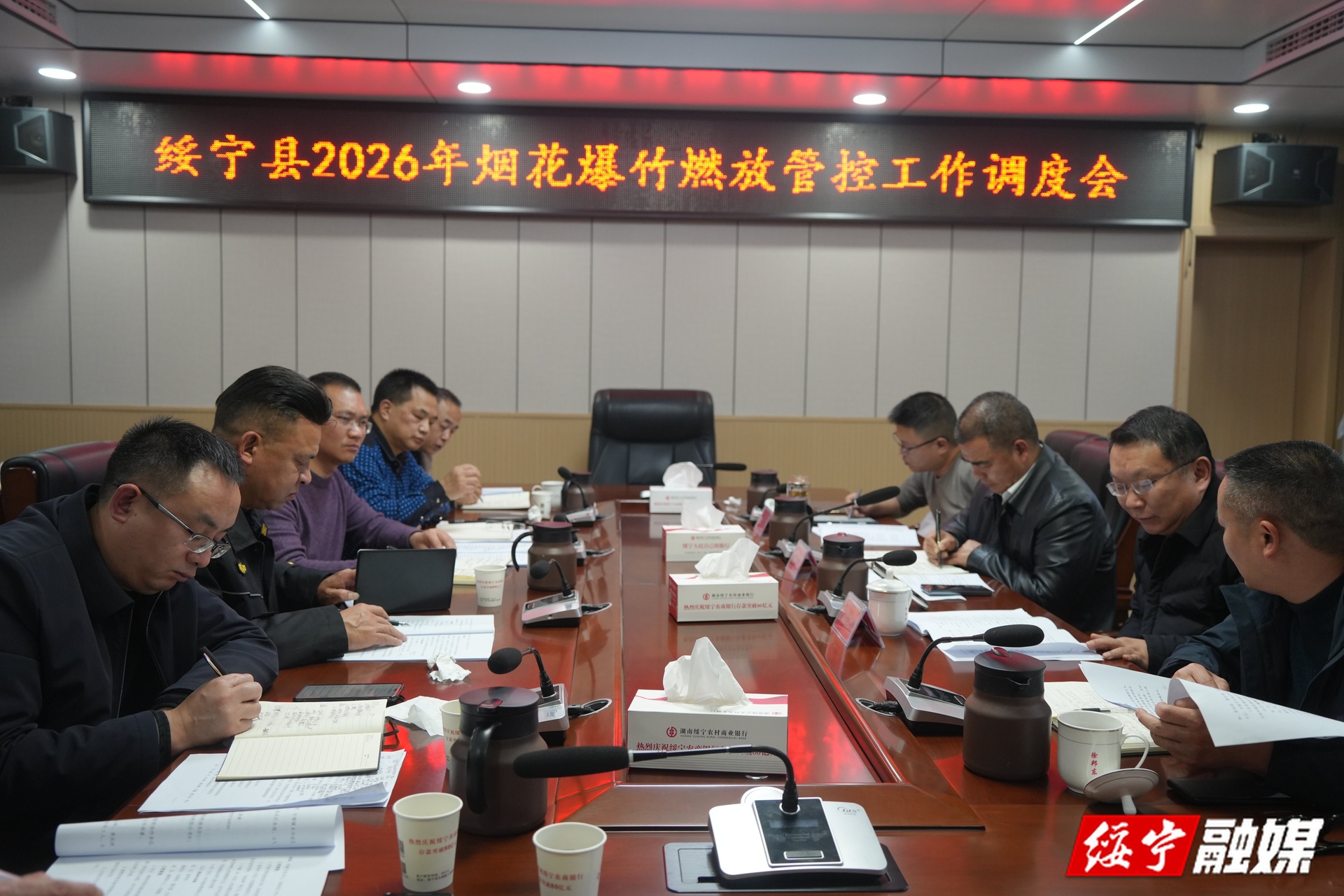 12月23日下午,绥宁县召开2026年烟花爆竹燃放管控工作会。副县长杨昌盛、孙红辉、张昆出席,相关职能部门及乡镇负责人参加会议。