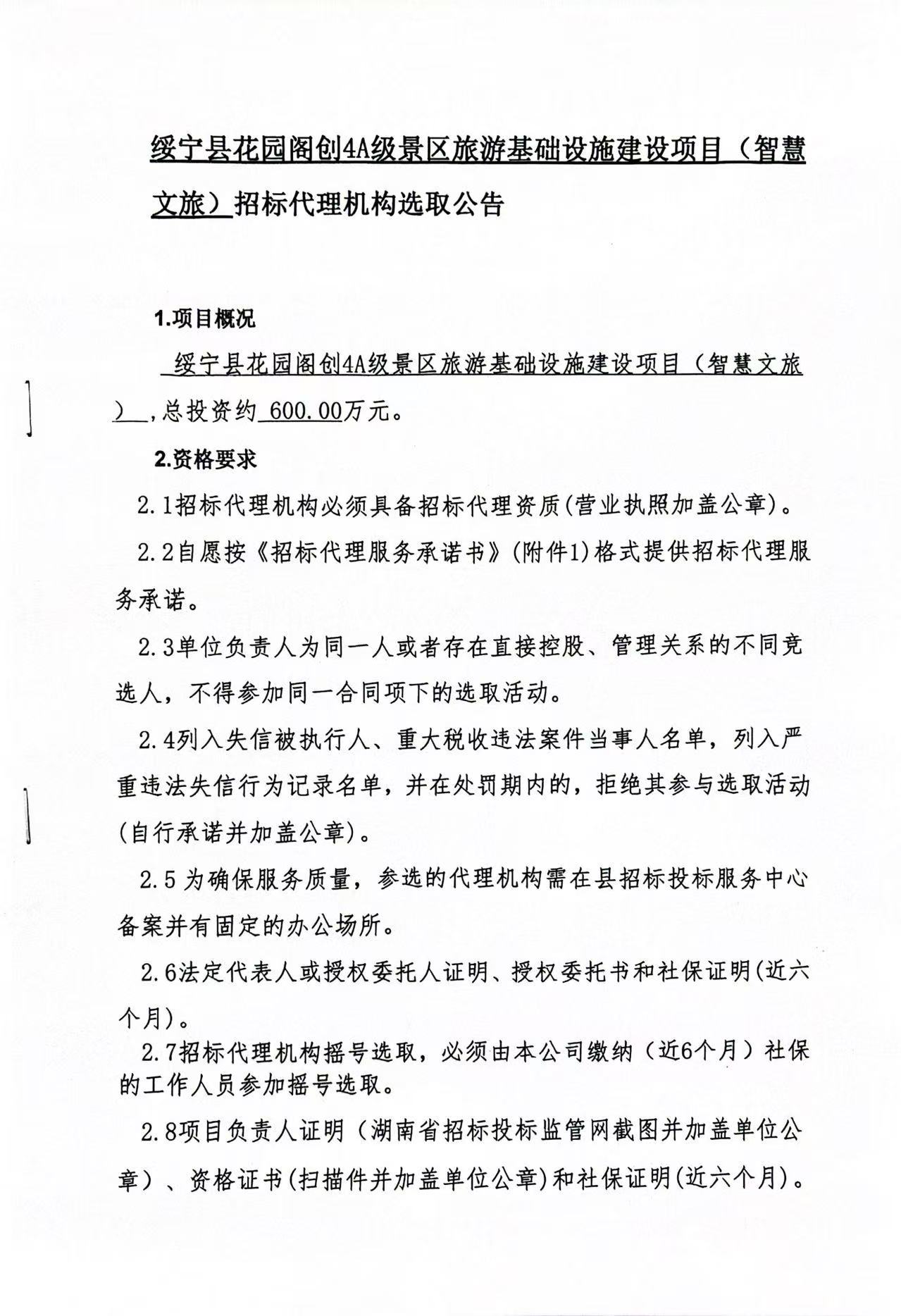 绥宁县花园阁创4A级景区旅游基础设施建设项目(智慧文旅) 招标代理机构选取公告