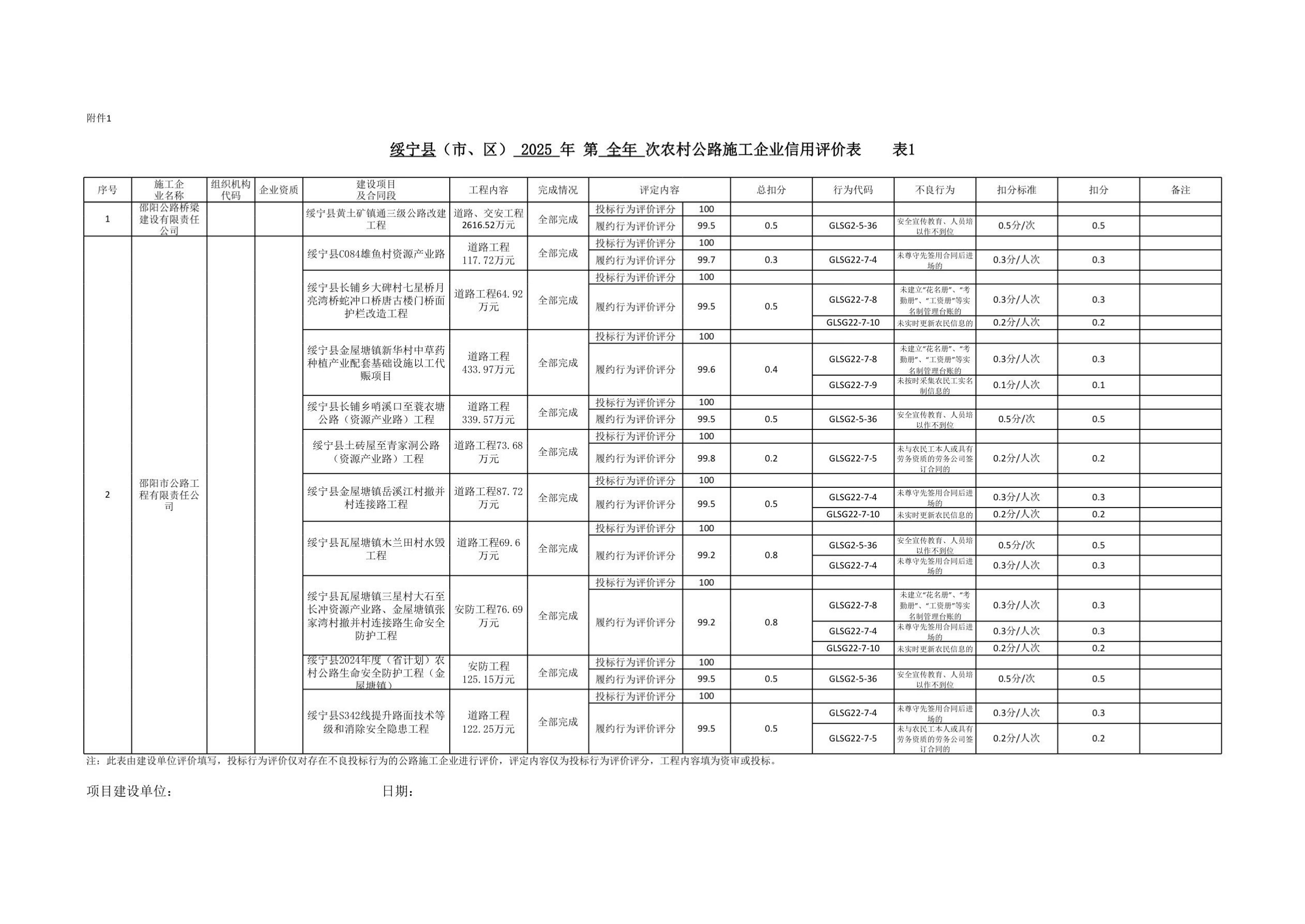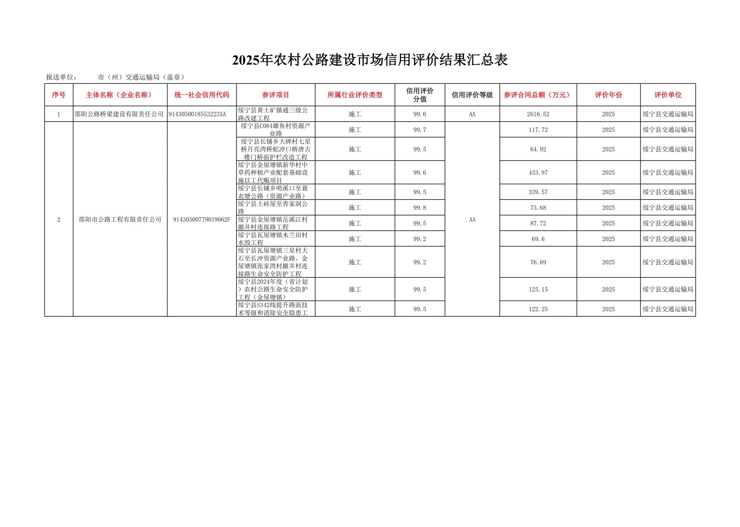绥宁县2025年农村公路建设信用评价结果公示
