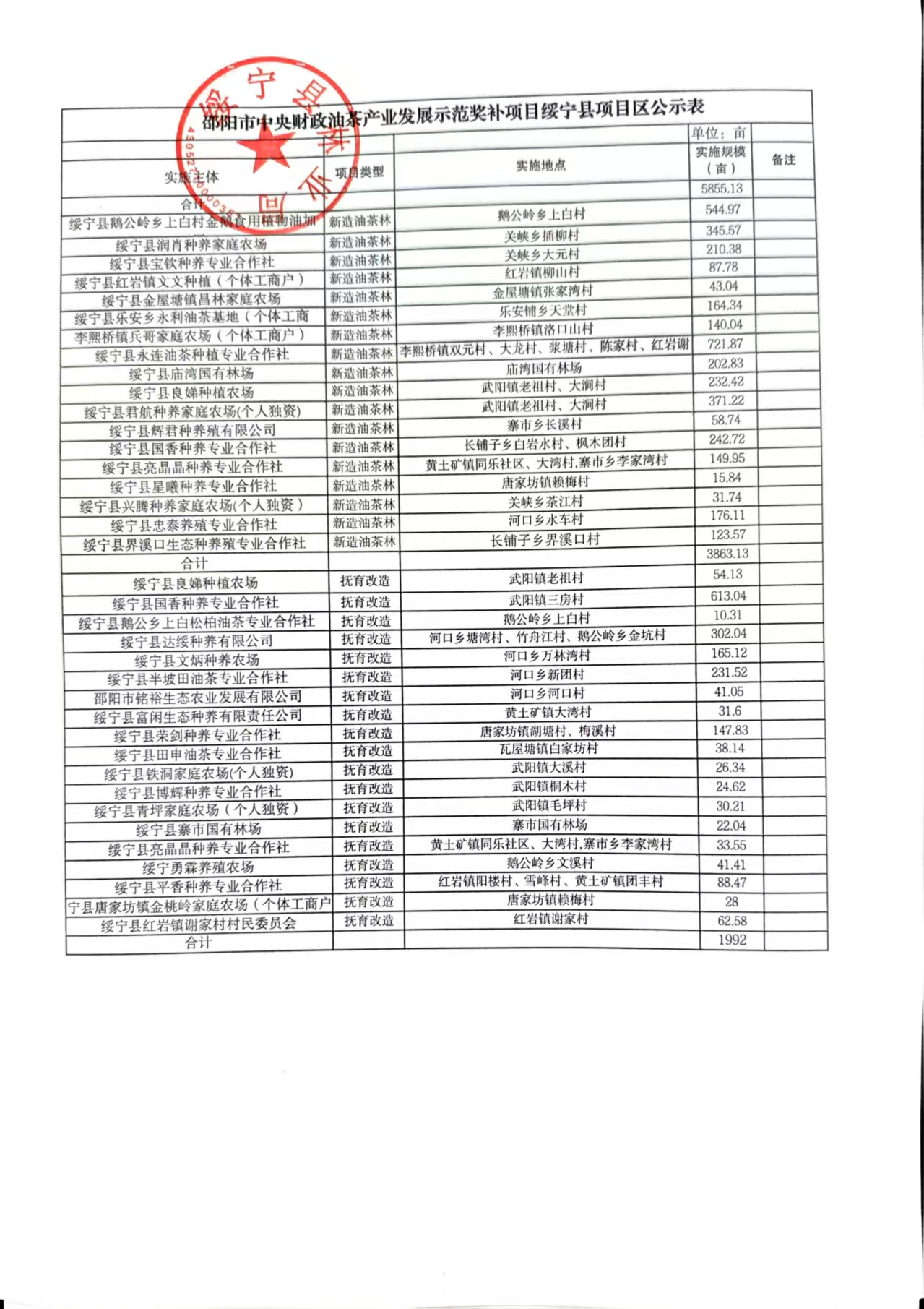 湖南省邵阳市中央财政油茶产业发展示范奖补项目绥宁县项目区奖补公示