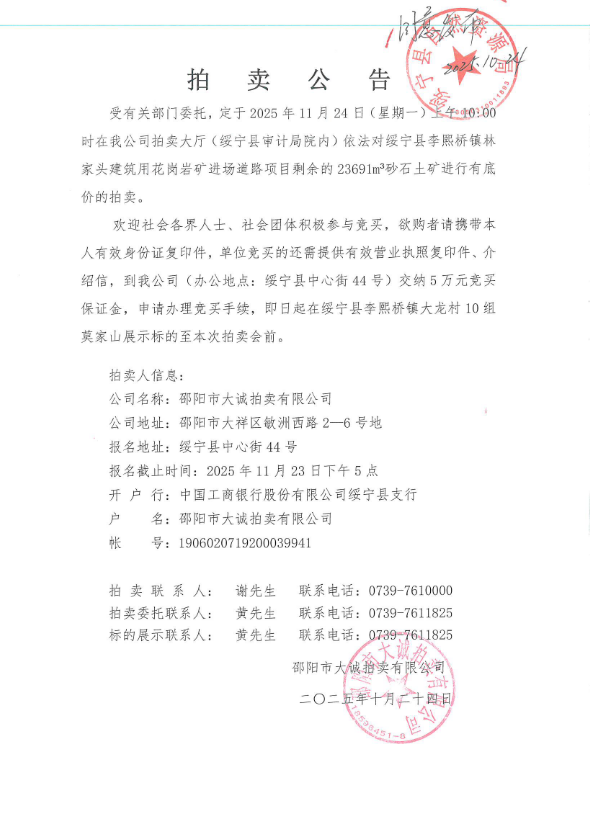 绥宁县李熙桥镇林家头建筑剩余砂石土矿拍卖公告