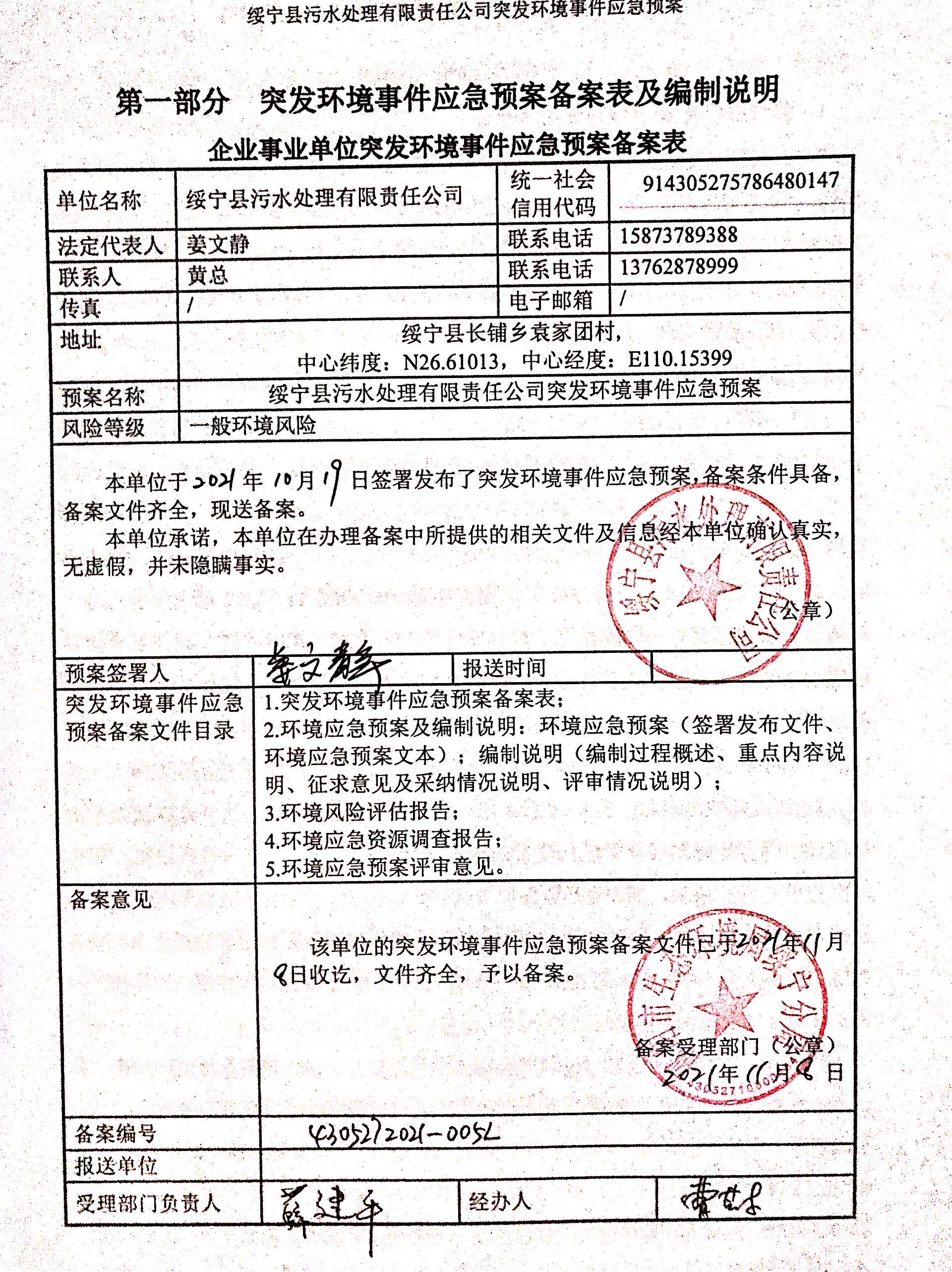 绥宁县污水处理厂有限责任公司突发环境事件应急预案备案表