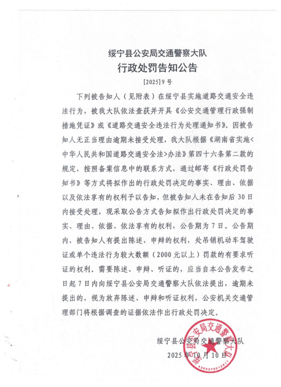 绥宁县公安局交通警察大队行政处罚告知公告[2025]9号
