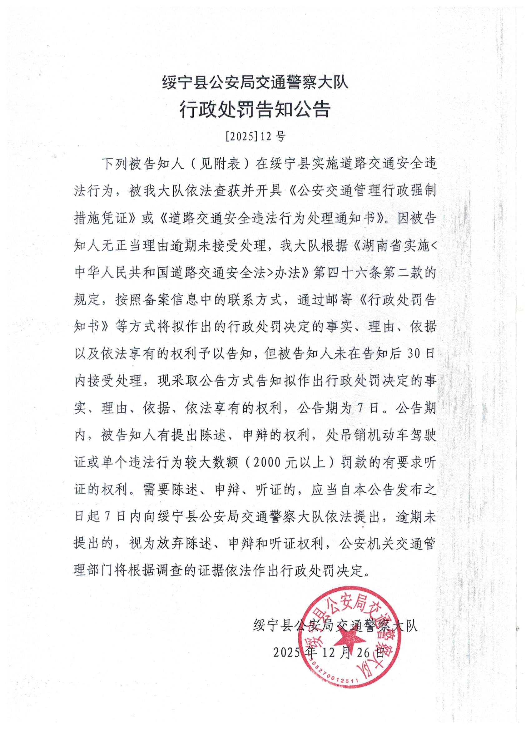 绥宁县公安局交通警察大队行政处罚告知公告([2025]12号)