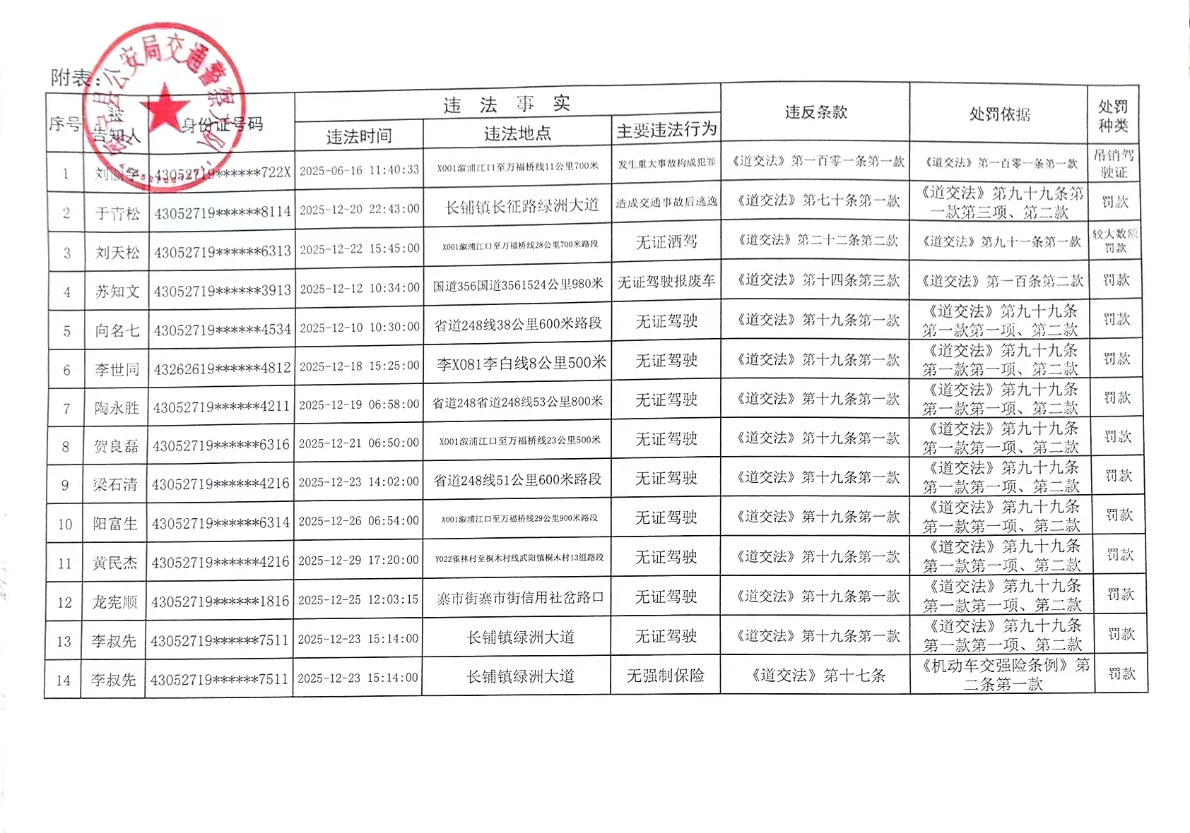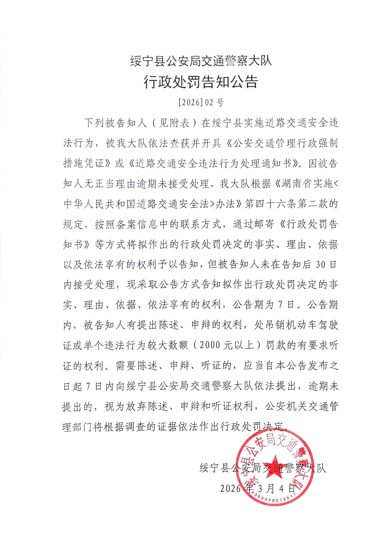 绥宁县公安局交通警察大队行政处罚告知公告([2026]02号)