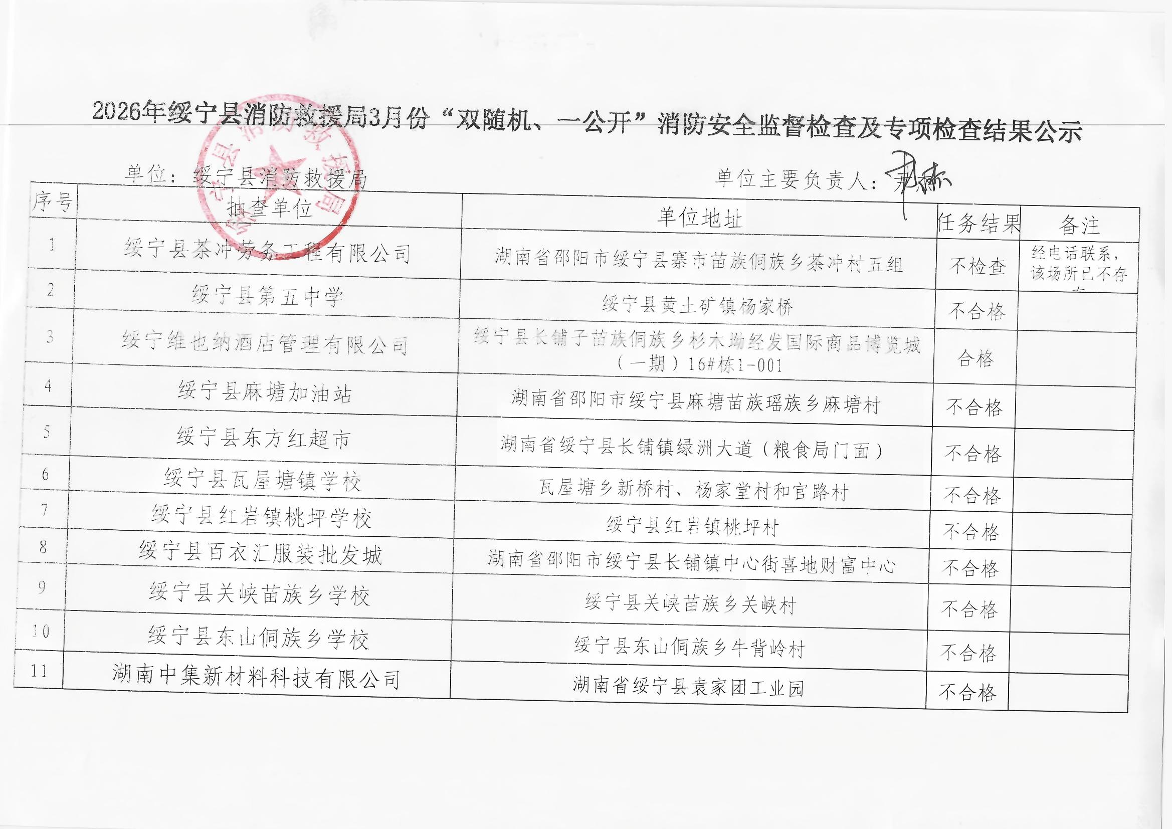 2026年绥宁县消防救援局3月份“双随机、一公开”消防安全监督检查及专项检查结果公示