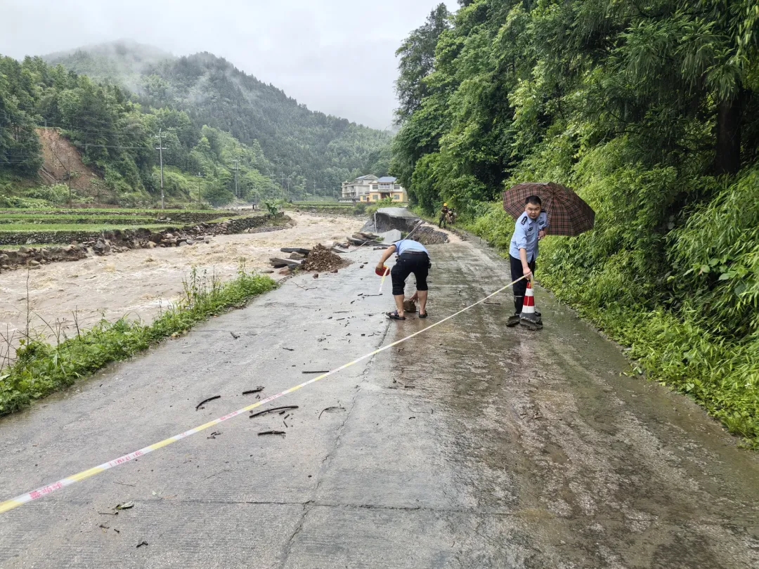 接警后,该所立即协同工作人员及村干部,对全镇风险地段展开拉网式巡查。巡查中,民警发现部分路段积水较深,水流湍急,存在严重安全隐患。为防止意外发生,民警辅警不顾雨水冲刷,在隐患路段紧急安装警示标志,并拉起警戒线隔离危险区域。同时,他们对围观群众耐心劝导:“洪水危险,不要在这里停留,赶紧回家注意安全!”