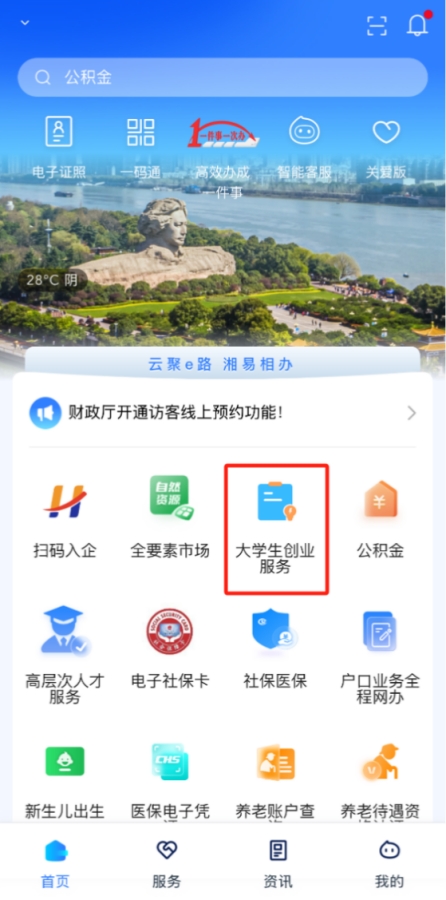 打开“湘易办”首页,点击金刚区“大学生创业服务”即可进入专区。这里整合了你的创业“全攻略”:政策引导、资金支持、孵化载体、咨询指导、项目展示、资源对接、活动赛事和创业典型等8大核心应用,还有1个大学生创业服务专区!