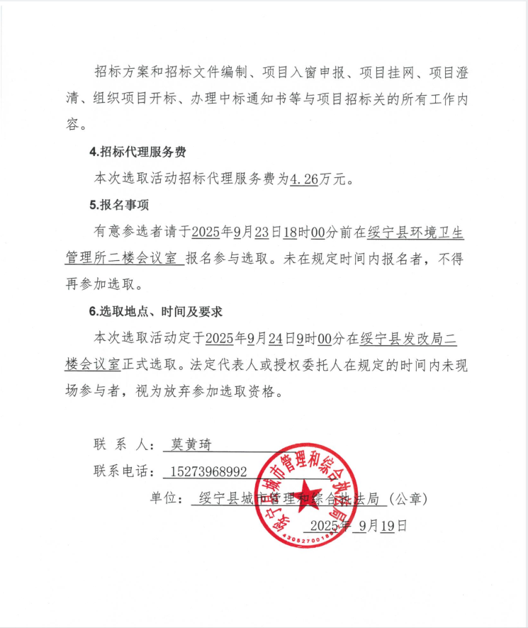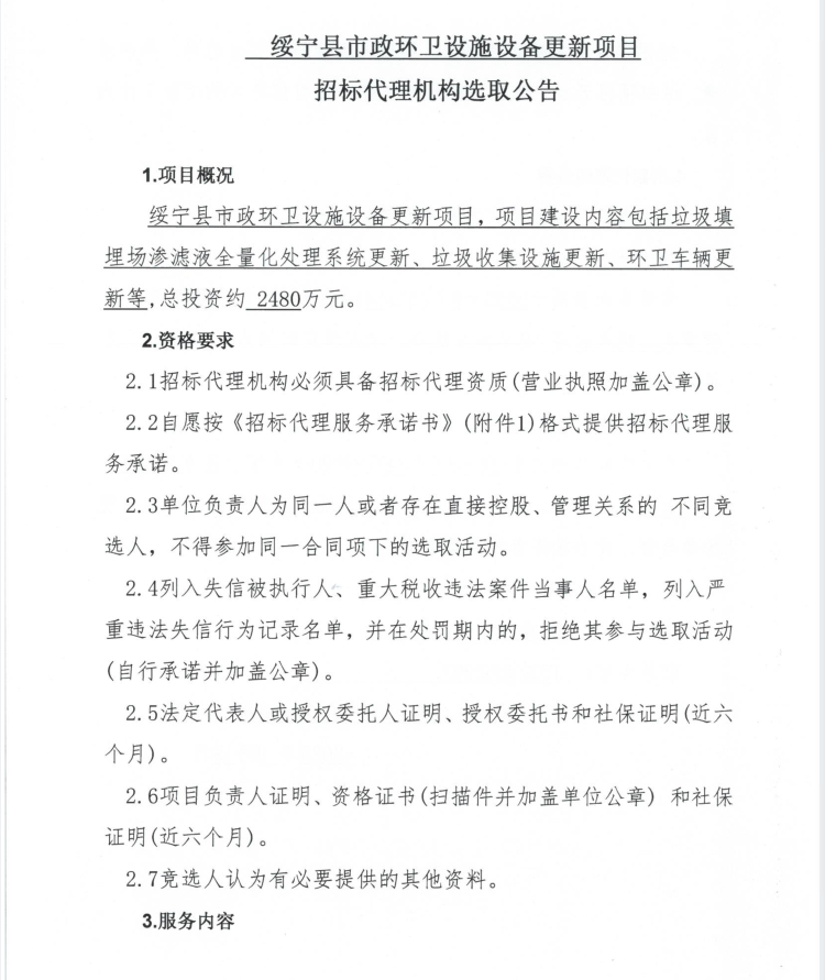 绥宁县市政环卫设施设备更新项目招标代理机构选取公告
