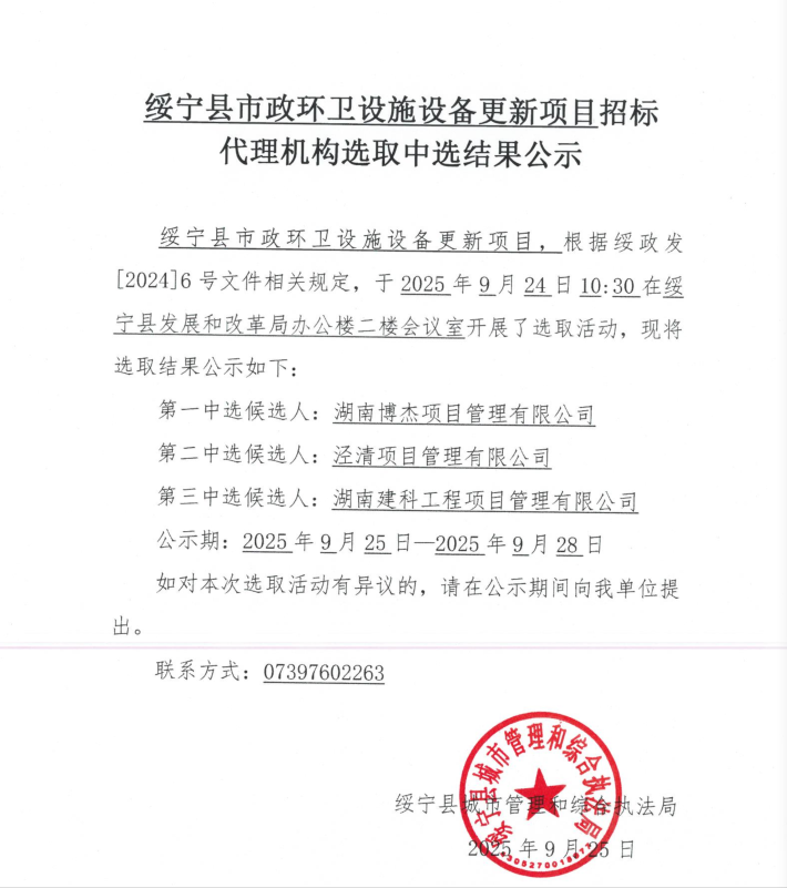 绥宁县市政环卫设施设备更新项目招标代理机构选取中选结果公示