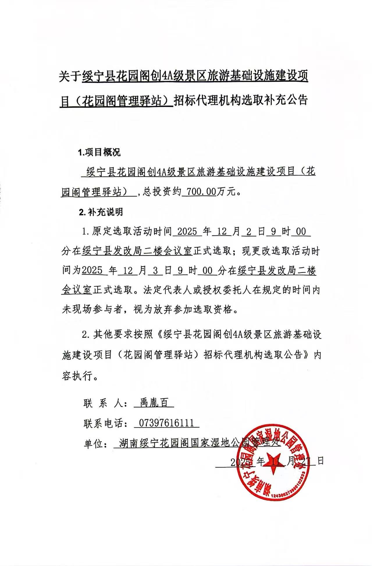 关于绥宁县花园阁创4A级景区旅游基础设施建设项目(花园阁管理驿站)招标代理机构选取补充公告