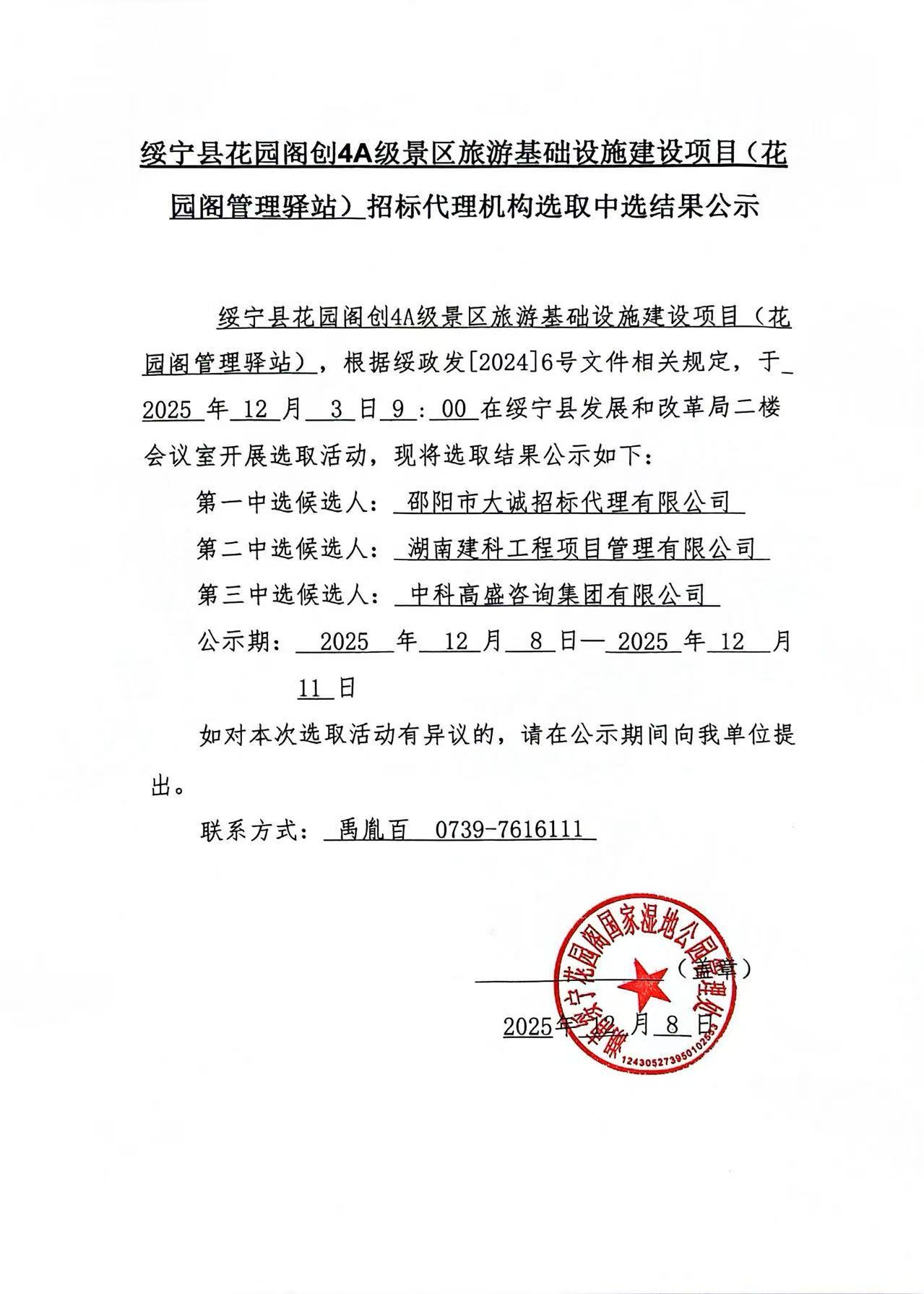 绥宁县花园阁创4A级景区旅游基础设施建设项目(花园阁管理驿站)招标代理机构选取中选结果公告