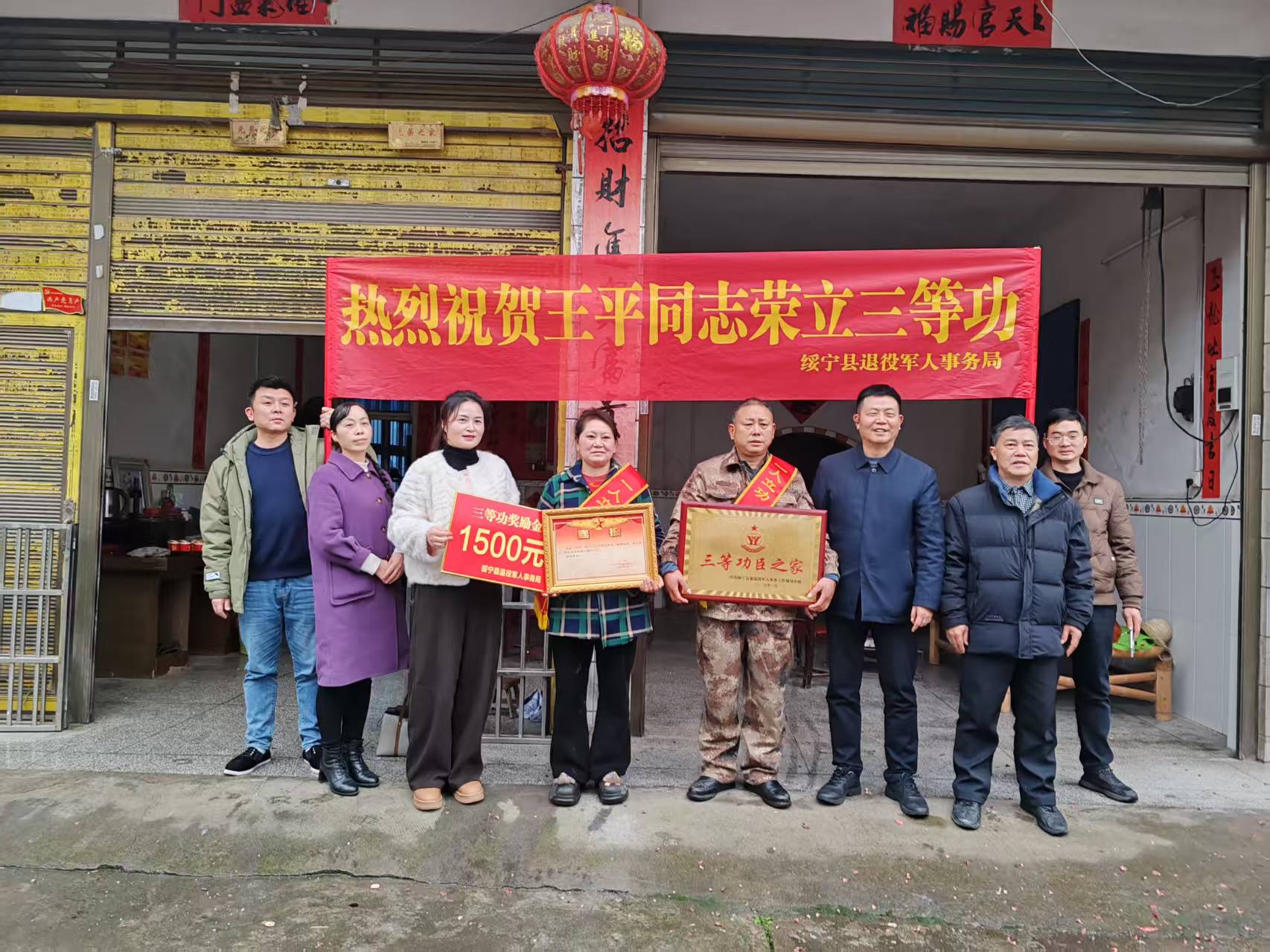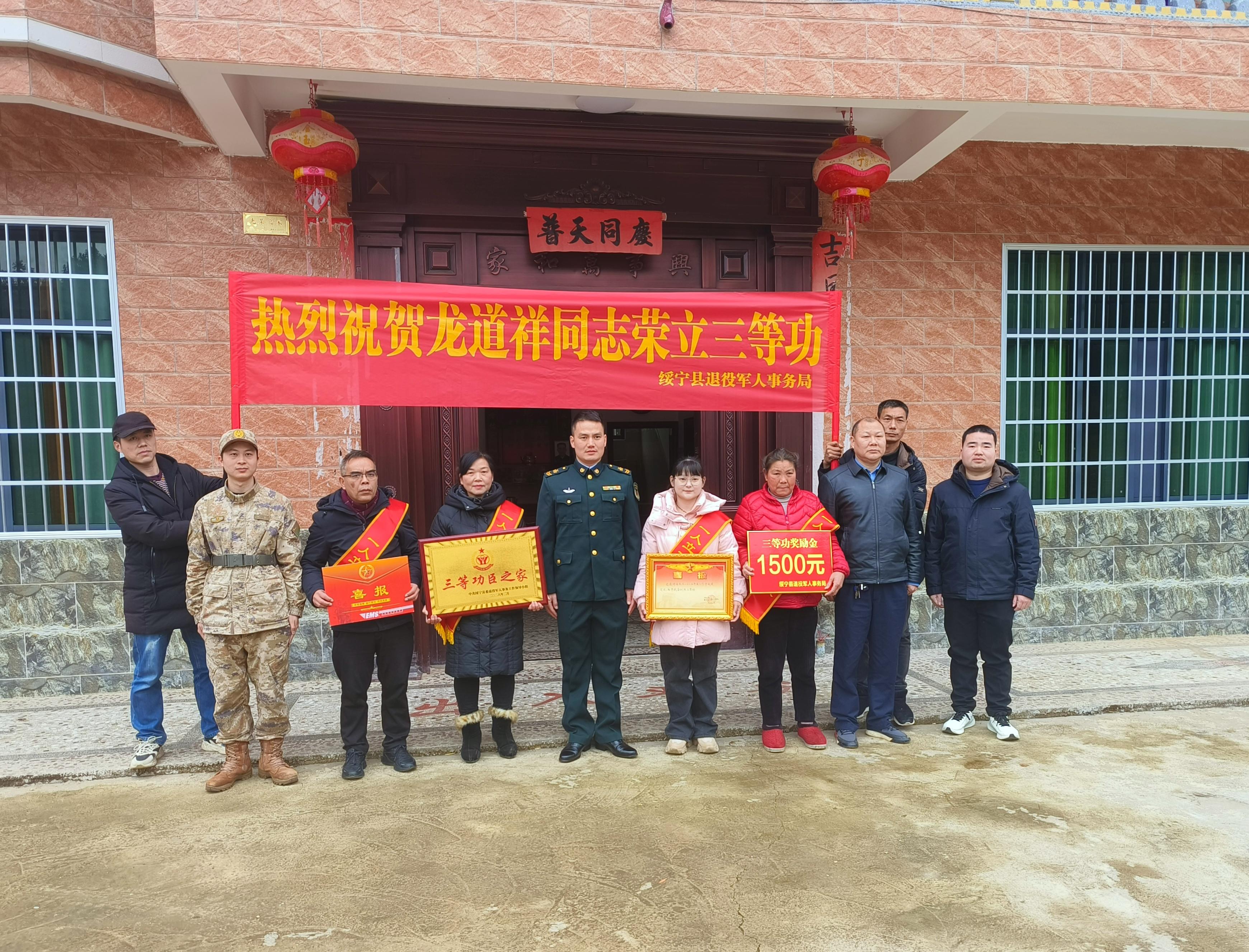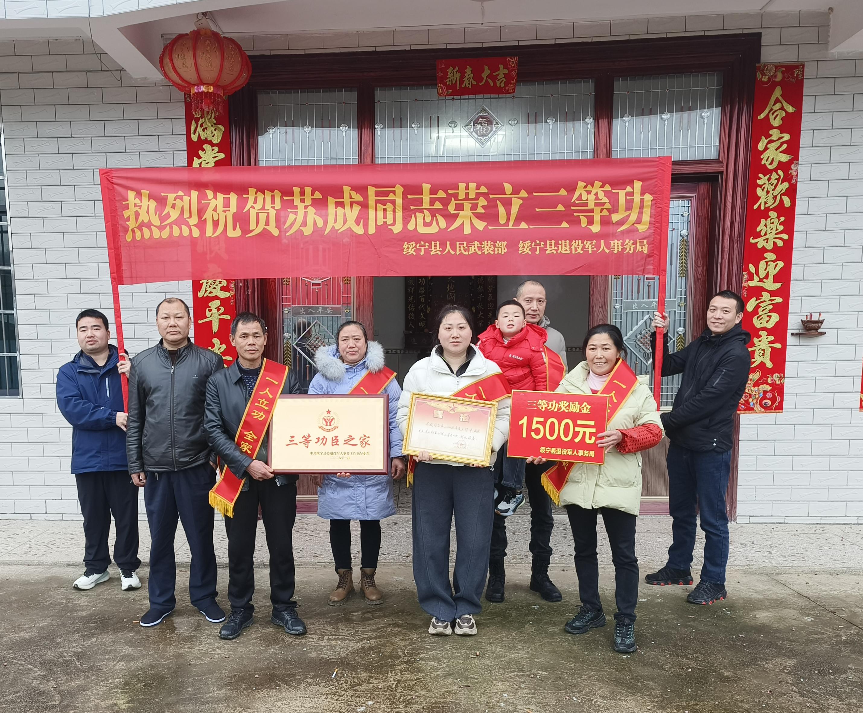 丙午新春至,军功喜报来。在2026年春节阖家团圆之际,绥宁县退役军人事务局联合县人武部,长铺镇、红岩镇、关峡苗族乡等乡镇以及相关村“两委”干部共同开展“新春送喜报荣光进万家”专项活动,为王平、肖洪圣、唐宇、龙道祥、唐晓东、苏成等6名荣立个人三等功的现役军人家庭送上喜报与新春祝福,让军属在团圆佳节中共享军功荣耀,让尊崇之光点亮新春年味。