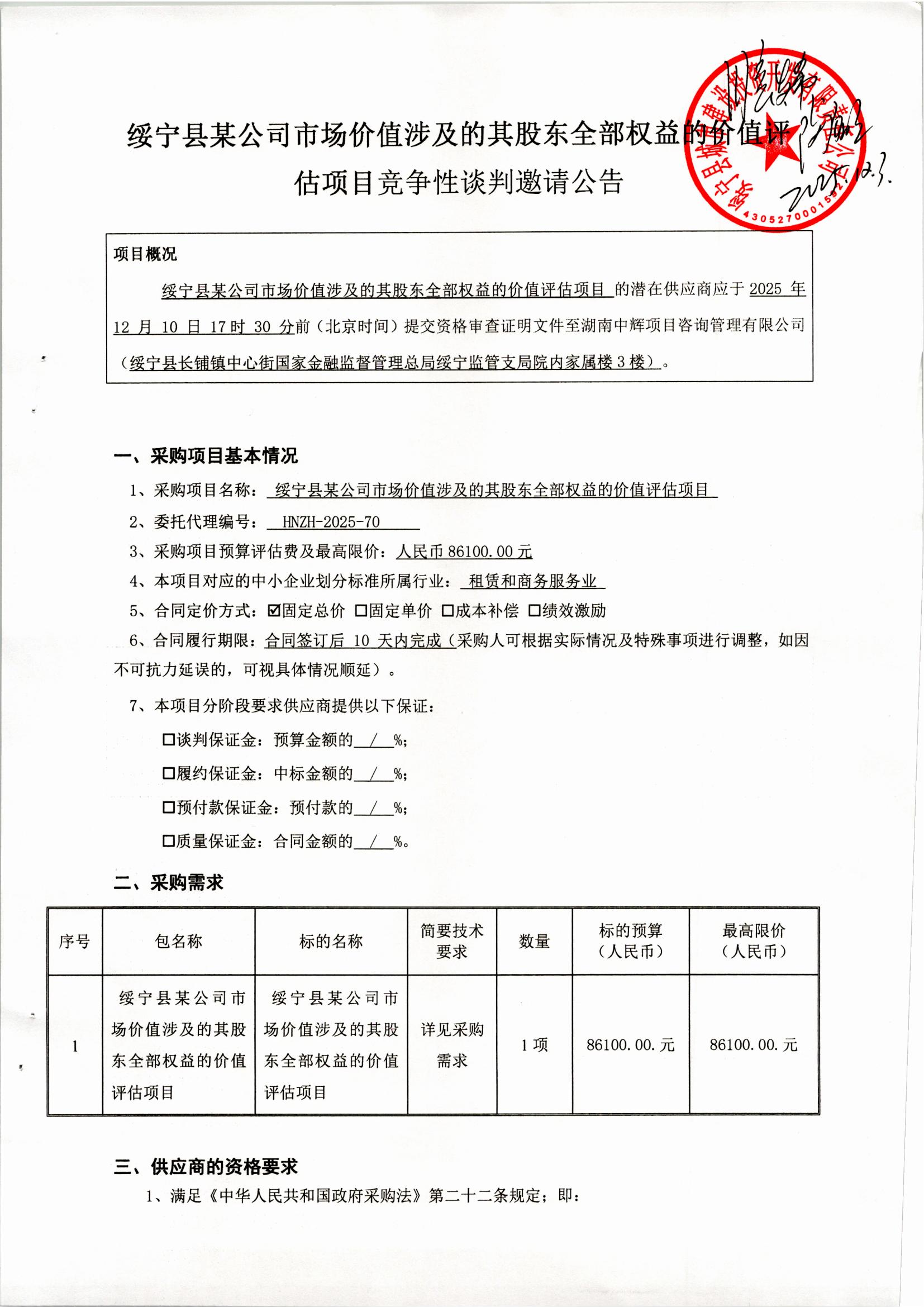 绥宁县某公司市场价值涉及的其股东全部权益的价值评估项目竞争性谈判邀请公告