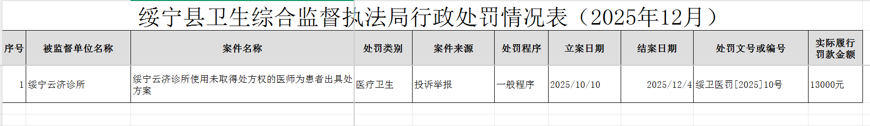 绥宁县卫生综合监督执法局行政处罚情况表(2025年12月)