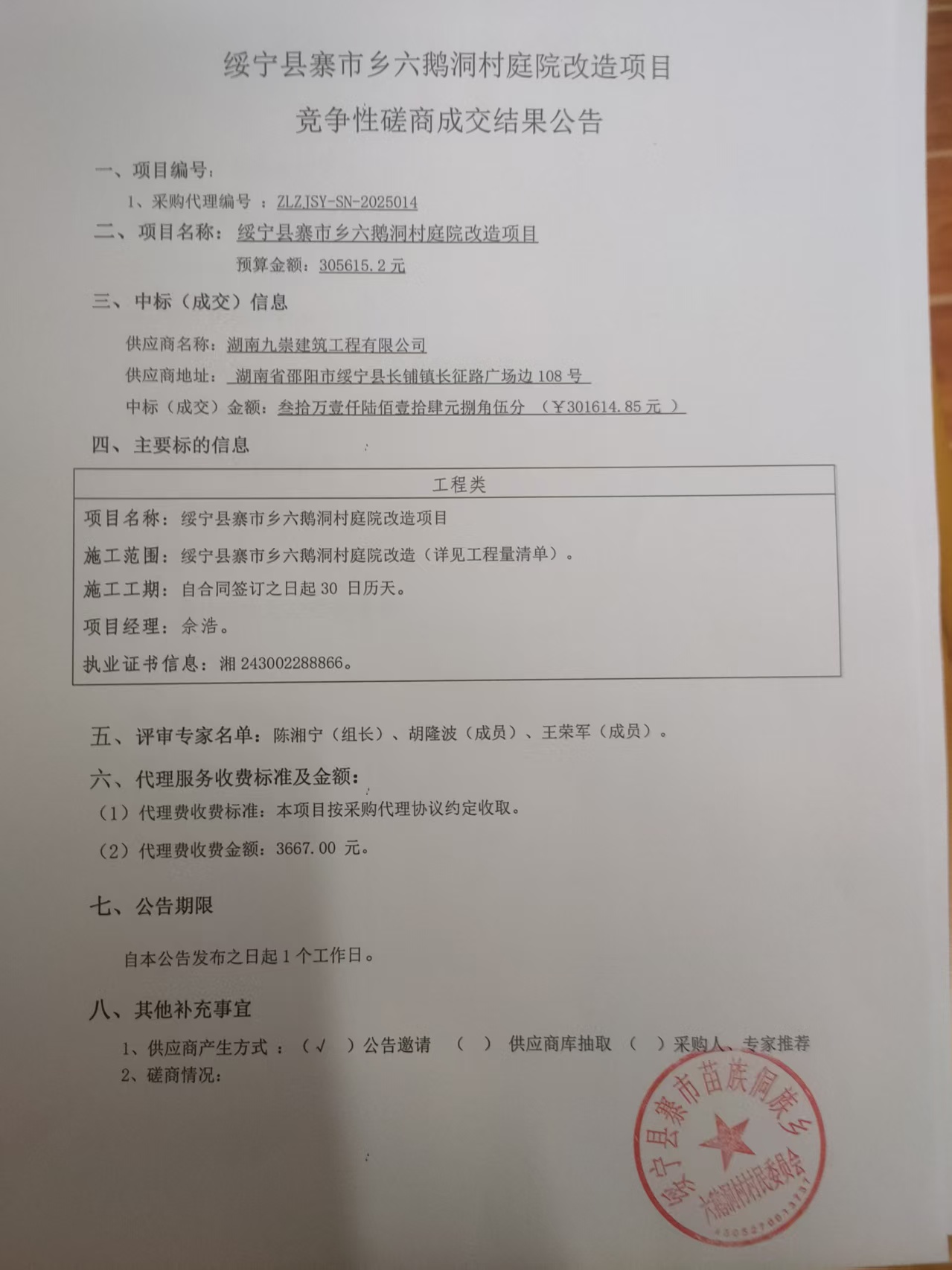 绥宁县寨市乡六鹅洞村庭院改造项目竞争性磋商成交结果公告