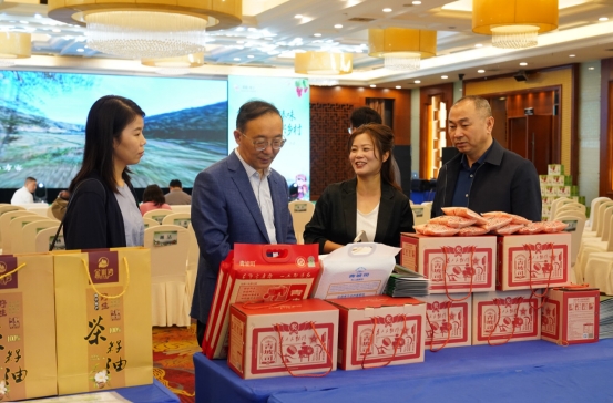 上午9点30分,暖场环节启动。嘉宾签到后步入五楼会场,东山红提、绥宁茶油、青钱柳、竹工艺品等十余种农特产品整齐陈列,饱满多汁的红提、香气浓郁的茶油引得嘉宾驻足品鉴。